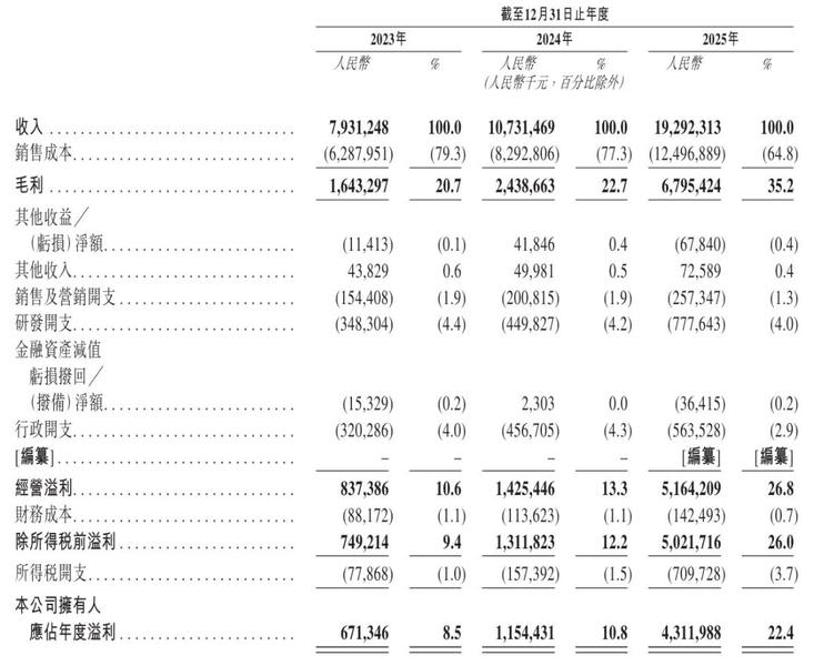 胜宏科技2023年、2024年、2025年经营利润分别为8.37亿、14.25亿元、51.64亿元;期内利润分别为6.7亿、11.5亿、43.12亿元;期内利润率分别为8.5%、10.8%、22.4%。