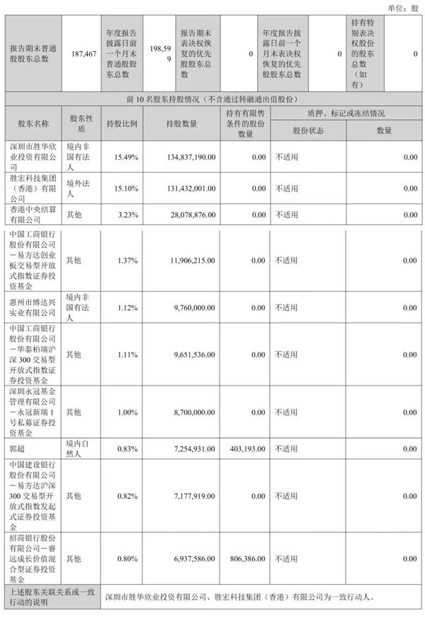 截至2025年12月31日,深圳市胜华欣业投资有限公司持股为15.49%,胜宏科技集团(香港)有限公司持股为15.1%,香港中央结算有限公司持股为3.23%,中国工商银行股份有限公司-易方达创业板交易型开放式指数证券投资基金持股为1.37%;