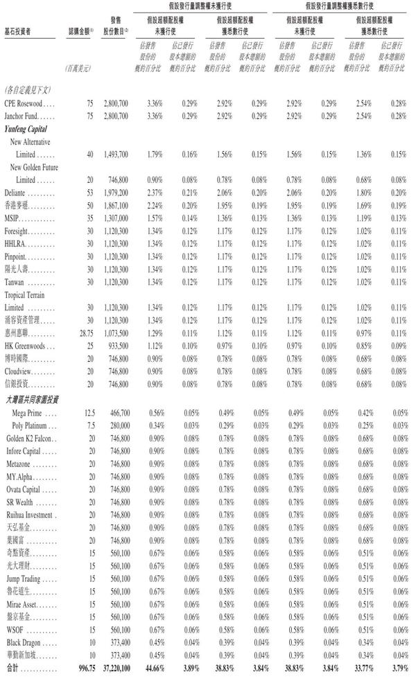 旺旺集团董事会主席蔡衍明旗下Deliante认购5300万美元,大族数控旗下香港麦逊认购5000万美元,摩根士丹利旗下MSIP认购3500万美元,Foresight、高瓴HHLRA、王强及鲍佳溶女士旗下Pinpoint、阳光人寿、Tanwan、博裕资本旗下Tropical Terrain、涌容资产管理分别认购3000万美元;